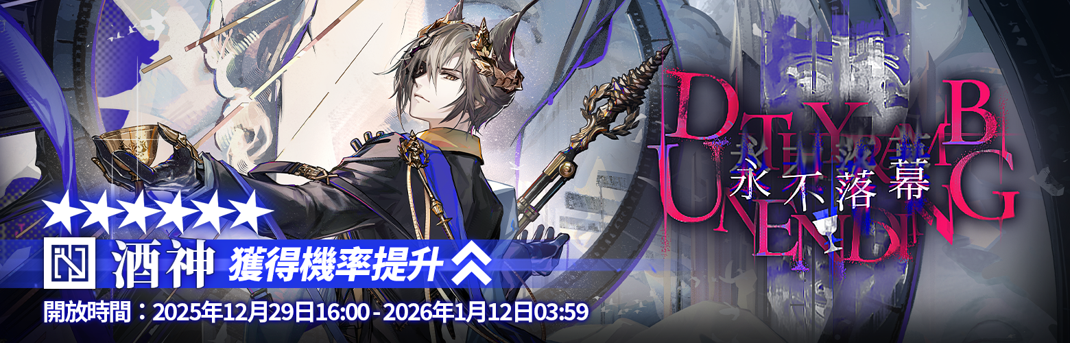 ◆新增幹員【酒神】、【蒂比】除加入【永不落幕】尋訪外,將在2026年01月12日04:00後加入並常駐其餘【標準尋訪】卡池