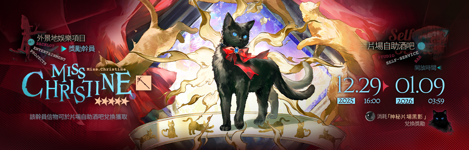 主要獎勵:活動幹員【★★★★★:Miss.Christine】、【藍卡塢攝影棚】傢俱(部分)、模組養成材料、「神秘片場黑影」等