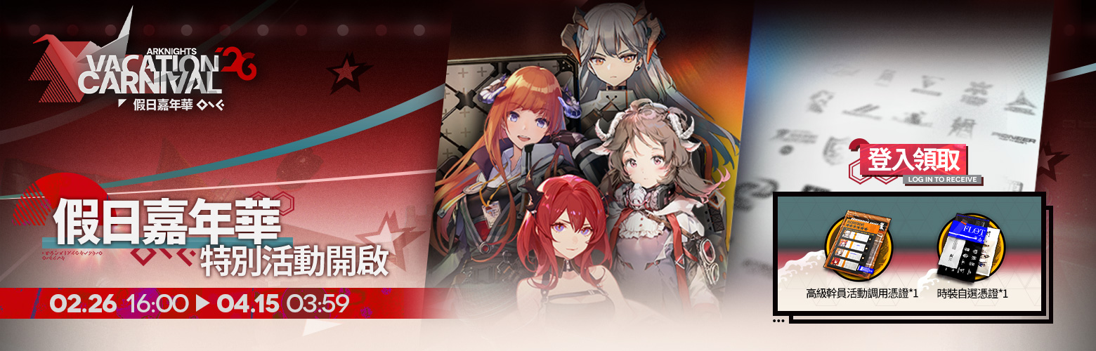 活動說明:活動期間內,玩家登入即可領取高級幹員活動調用憑證*1(使用後可在【塞雷婭】【風笛】【艾雅法拉】【史爾特爾】中自選一位六星幹員)、時裝自選憑證*1(使用後可兌換一件時裝商店正在售賣且符合兌換條件的時裝)獎勵
