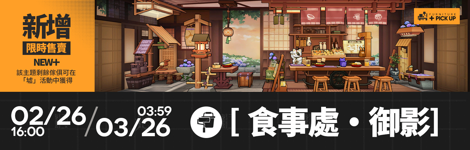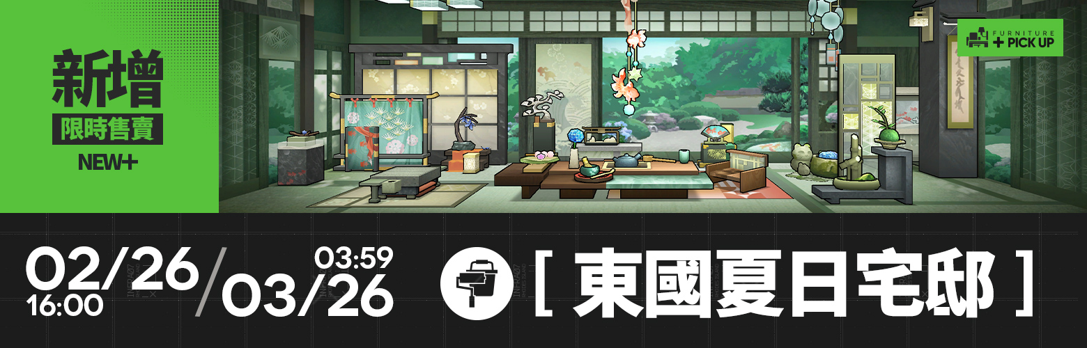 活動說明:活動期間新增活動限定傢俱【東國夏日宅邸】系列與【食事處·御影】系列