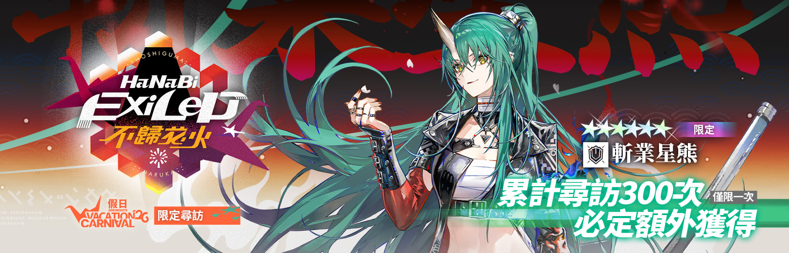 在本期【限定尋訪】中,累計尋訪300次,可以額外獲得限定幹員斬業星熊(僅限一次)。該次6星限定幹員的獲取是額外贈送,不產出【尋訪資料契約】,同時也不會影響本期【限定尋訪】獲得下一個6星幹員的機率,該累計次數會在本期【限定尋訪】的結束時清零(後續相關限定尋訪都將應用同類規則,即:首次尋訪300次時,必定有獲得1次額外領取當期限定幹員的機會,且僅限一次。該規則的計數僅與該限定尋訪綁定,不會跨尋訪繼承)