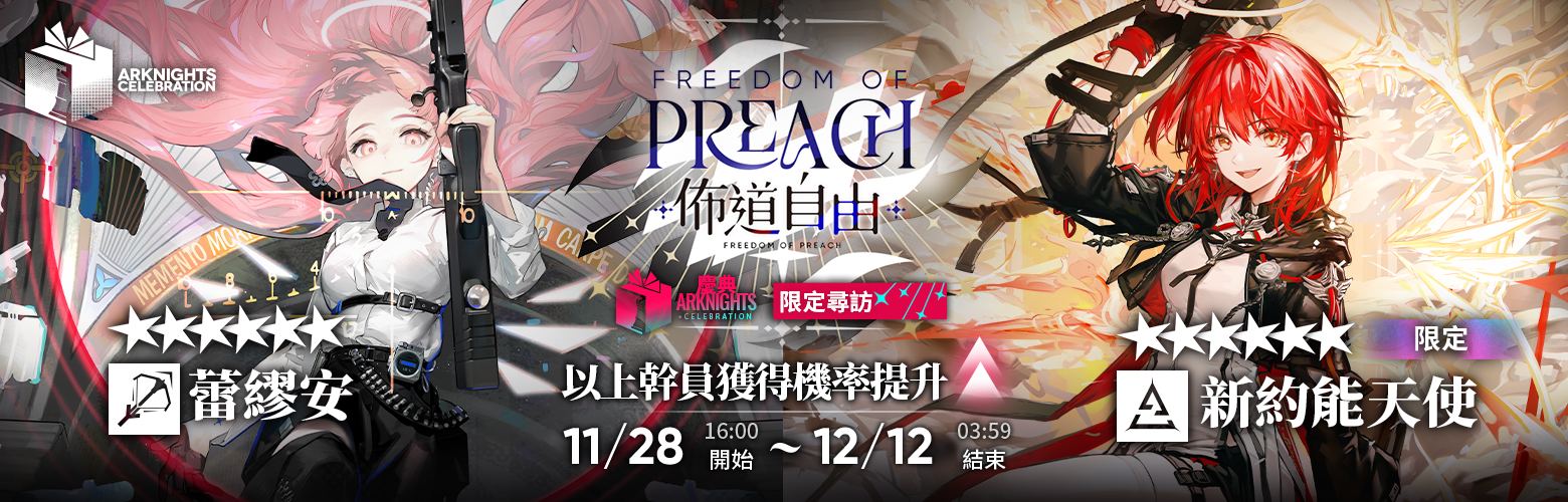 活動說明:活動期間【限定尋訪·慶典】-【佈道自由】尋訪開啟,該尋訪中以下幹員出率上升