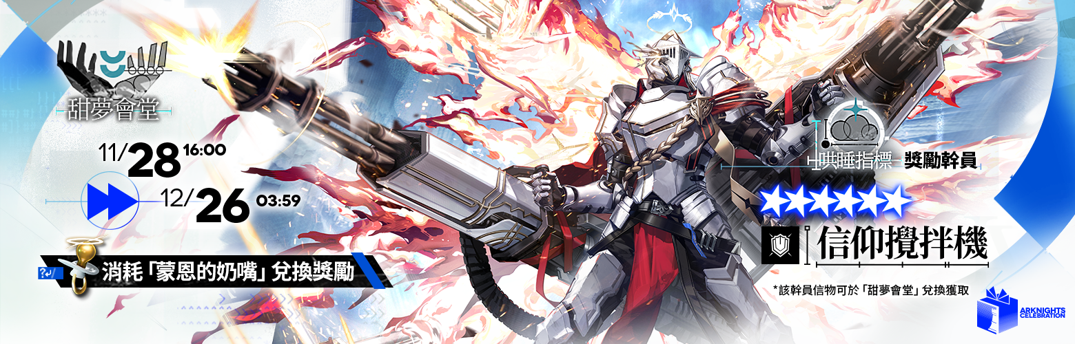 主要獎勵:活動幹員【★★★★★★:信仰攪拌機】、【潘格尼尼的銃械工坊】傢俱(部分)、模組養成材料、蒙恩的奶嘴等