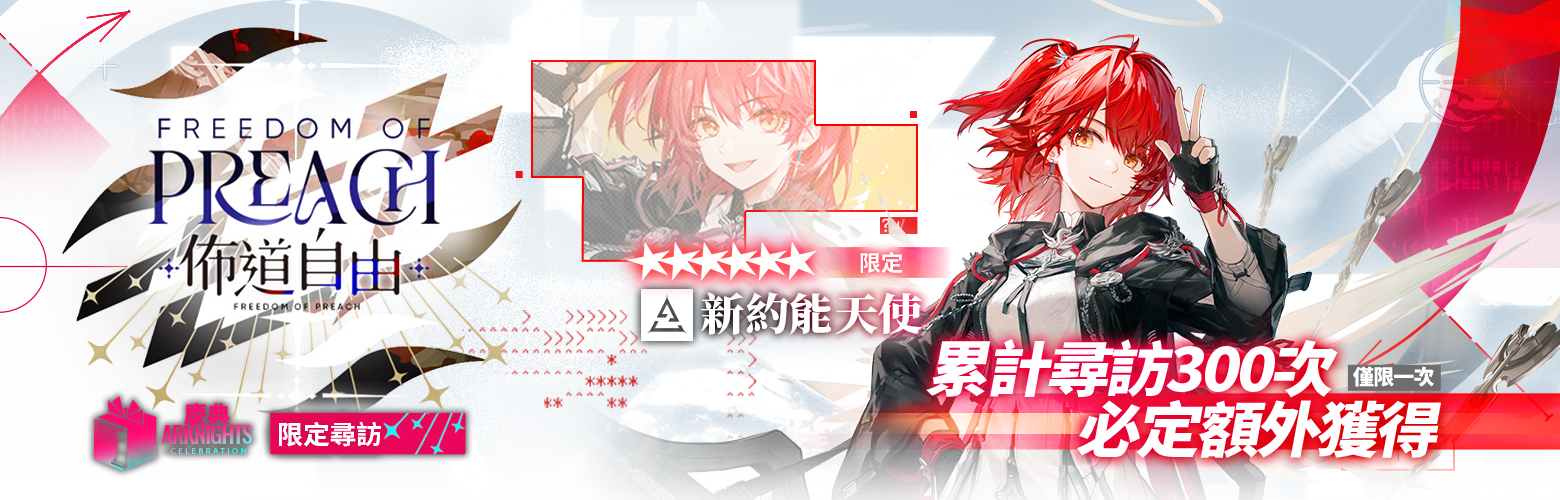 在本期【限定尋訪】中,累計尋訪300次,可以額外獲得限定幹員新約能天使(僅限一次)。該次6星限定幹員的獲取是額外贈送,不產出【尋訪資料契約】,同時也不會影響本期【限定尋訪】獲得下一個6星幹員的機率,該累計次數會在本期【限定尋訪】的結束時清零(後續相關限定尋訪都將應用同類規則,即:首次尋訪300次時,必定有獲得1次額外領取當期限定幹員的機會,且僅限一次。該規則的計數僅與該限定尋訪綁定,不會跨尋訪繼承)