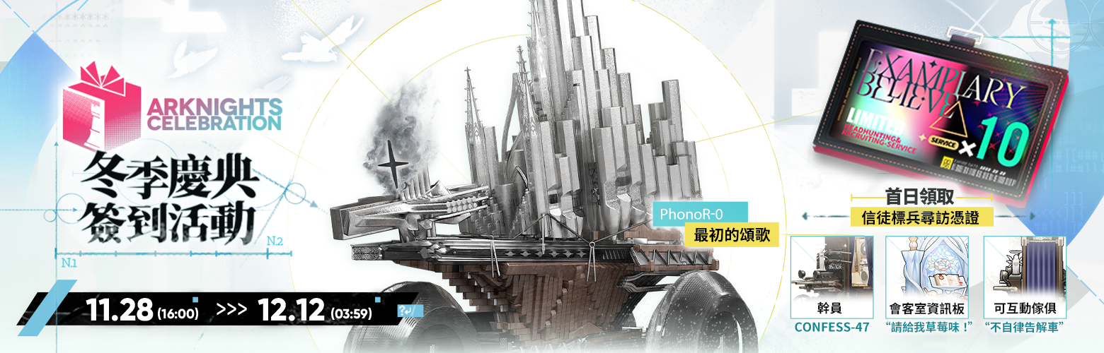 活動說明:活動期間內,玩家累計活動簽到10日可獲得信徒標兵尋訪憑證、PhonoR-0專屬時裝、幹員【★:CONFESS-47】、會客室功能傢俱(資訊板)、可交互傢俱等獎勵