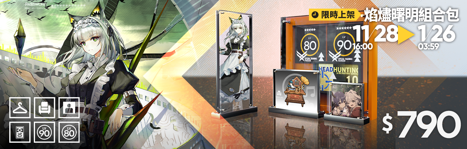 組合包內容:時裝【忒斯特收藏系列 - 午夜郵差 - 能天使】、主題傢俱【龍門風情茶室】、頭像「徘徊歧路」*1、十連尋訪憑證*1、龍門幣*200000、高級作戰記錄*60、技巧概要·卷3*30