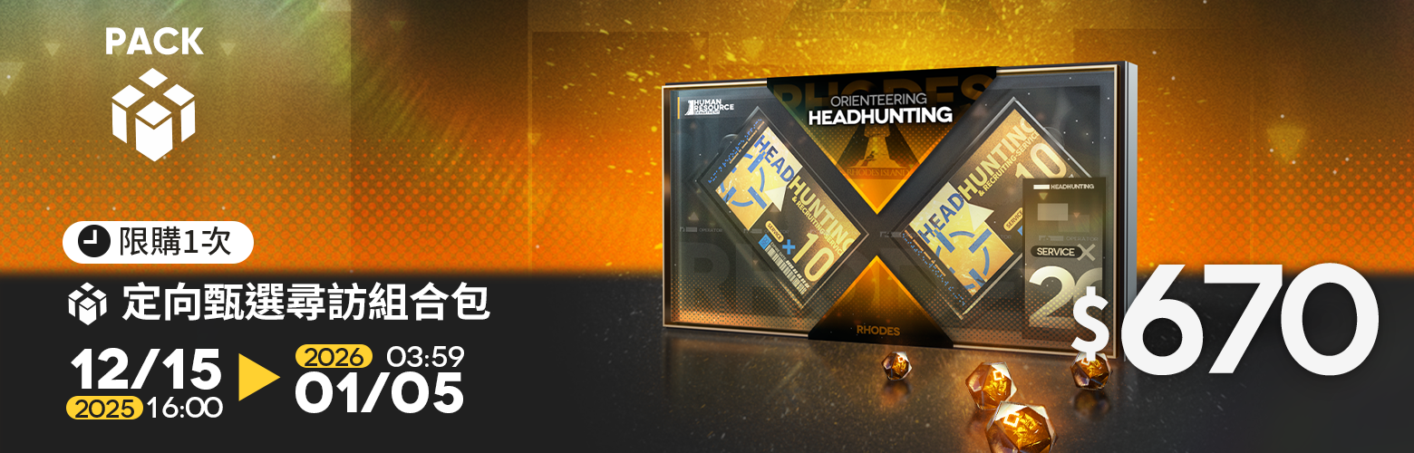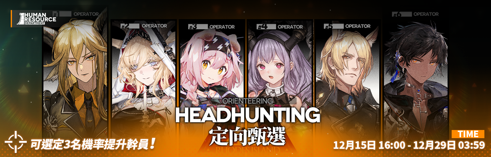 活動說明:活動期間,玩家可在當期甄選的幹員範圍內自主選擇並鎖定3名六星幹員和3名五星幹員作為當期【定向甄選】尋訪出現機率提升的幹員(當期【定向甄選】可能出現的六星幹員僅包括自選機率提升的3名六星幹員)